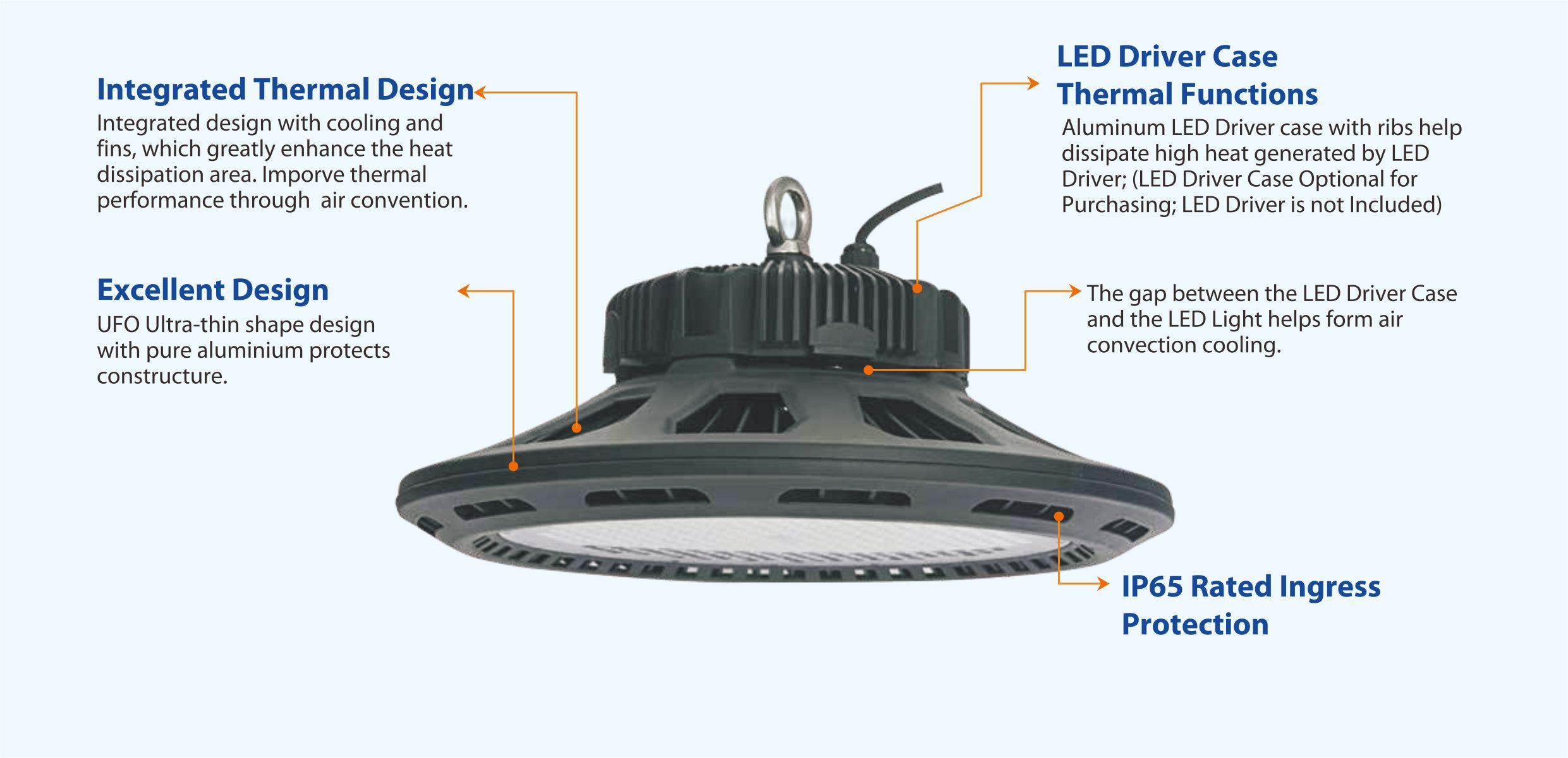 | Model NumberPower(W)Size(mm)Lamp Panel size(mm)Chip ModelLED QTY (pcs)Series/ParallelElectricalParameterHU1100100W∮260x68∮149x2SMT/30301547S/22P21.6-36V (2.7A)HU1160160W∮325x78∮199x2SMT/30302457S/35P21.6-36V (4.5A)HU1240240W∮400x86∮258x2SMT/30303609S/40P36-60V (4.5A) | |